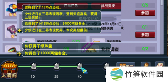 1.每天活跃积分达到25点之后,可以获得12000两储备金,有一定几率奖励翻倍。活跃积分达到40点后同样可以获得12000两储备金,而且还可以获得一个红罗羹或绿芦羹作为补给。