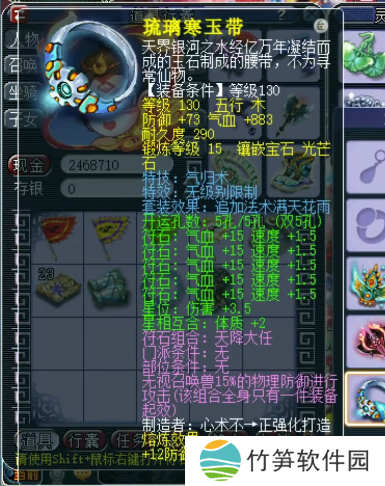 130级无级别气归术腰带,15锻光芒石,熔炼后防御+85,气血+914。