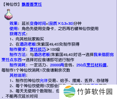 为了发挥变身卡最大价值,老玩家一般会去买一个“神仙饮”。该道具有延长变身时间的效果,延长的时间为品质*0.3+30分钟。也就是说,你变身后吃一个120品的神仙饮,就可以将你的变身时间延长66分钟,这个延长时间可以直接叠加在变身卡剩余时间上。