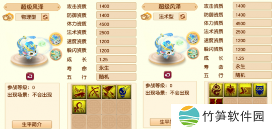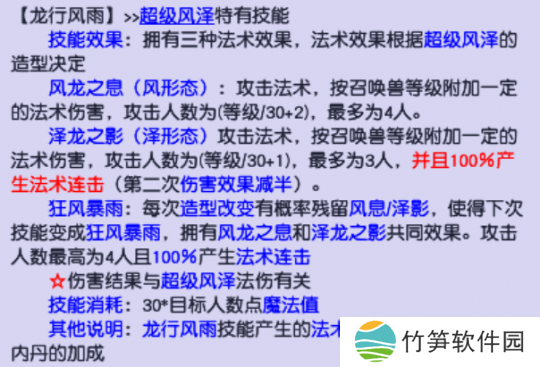超级风泽和其他神兽一样,拥有物理和法术两种形态。其中,物理形态的技能为:高级神佑复生、高级连击、高级合纵、驱鬼和高级偷袭,法术形态的技能为:专属技能龙行风雨、高级魔之心、高级敏捷、高级感知、高级法术暴击。