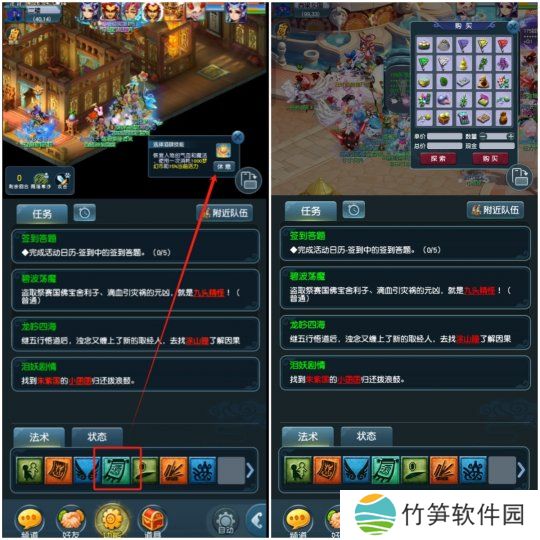 令人尴尬的是,在使用如酒肆,仙灵药铺等会打开二级界面的功能时,对应功能并不会出现在下方区域,而是显示在上方的游戏场景界面中,这给单手操作带来了一定的难度。