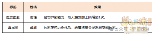 性格标签【魔族血脉】可以提升魔君护佑的上限,使玩家再也不用担心任务中突然暴毙造成损失了。因为【魔族血脉】属于“理性”标签,“理性”属性越高时越容易获得。