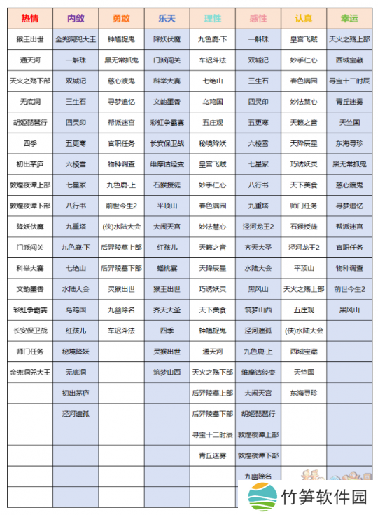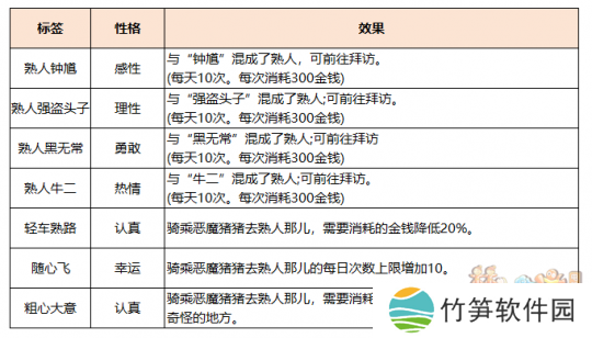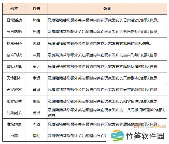玩家骑乘恶魔猪猪体验你的生活和各种玩法(周末活动、普通副本、侠士副本、天命副本、捉鬼、如梦奇谭、帮派迷宫等),将触发形形**的恶魔猪猪调皮捣蛋的事件,完成后可以提升恶魔猪猪的“性格属性”。不同玩法可获得的性格属性不同,具体见下表。