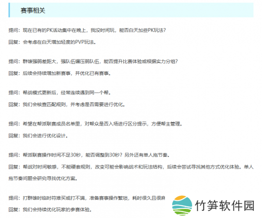 赛事相关的问题主要集中在日常PK上,策划也表示会考虑增加在白天的轻度PVP玩法,并会根据大家的实力优化已有赛事。除此之外,策划相当重视帮派联赛的体验,有望会对成员管理、单人拖节奏、赛前准备过多等的问题进行优化。