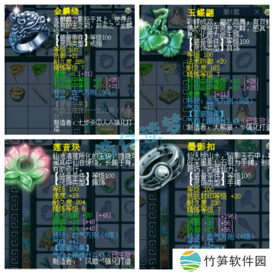 戒指和耳饰下排都是双封印一速度,配饰下排双防御一法防,手镯下排双防御一气血,特效都是6级血气方刚!
