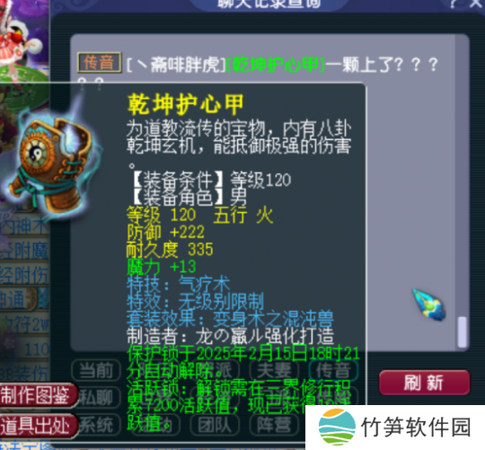 年前不少玩家都出货了,这位玩家还发传音分享了这份喜悦。他鉴定出120级无级别气疗男衣,它的防御222且加13魔都不错,还能熔炼真是发财了。