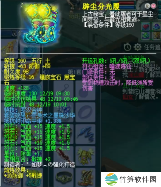 基础防御105,基础敏捷68,附带1.33%抗封特性,附加特技罗汉金钟的160级鞋子。