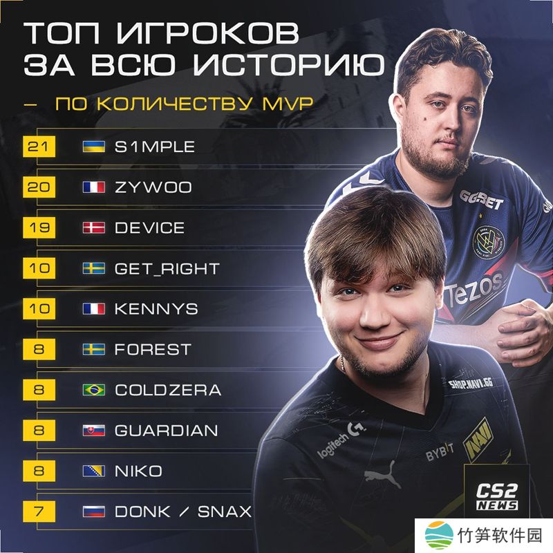 donk也成为首位进入该榜单的俄罗斯选手。排名第一的仍是s1mple,他共获得21个MVP头衔,ZywOo、device紧随其后。