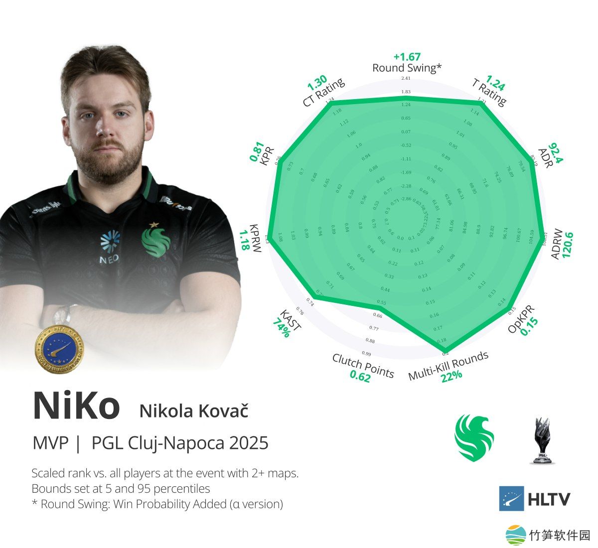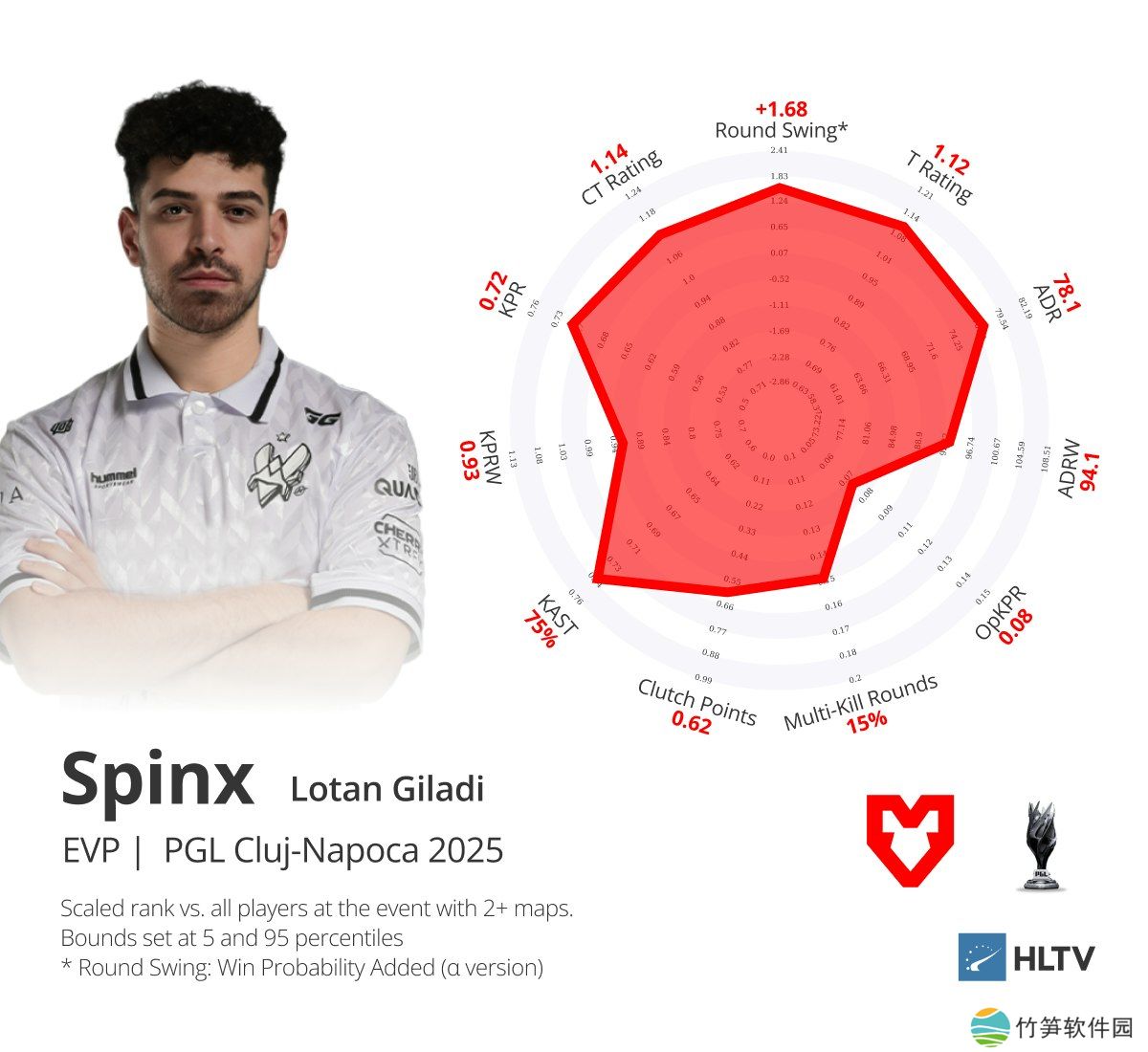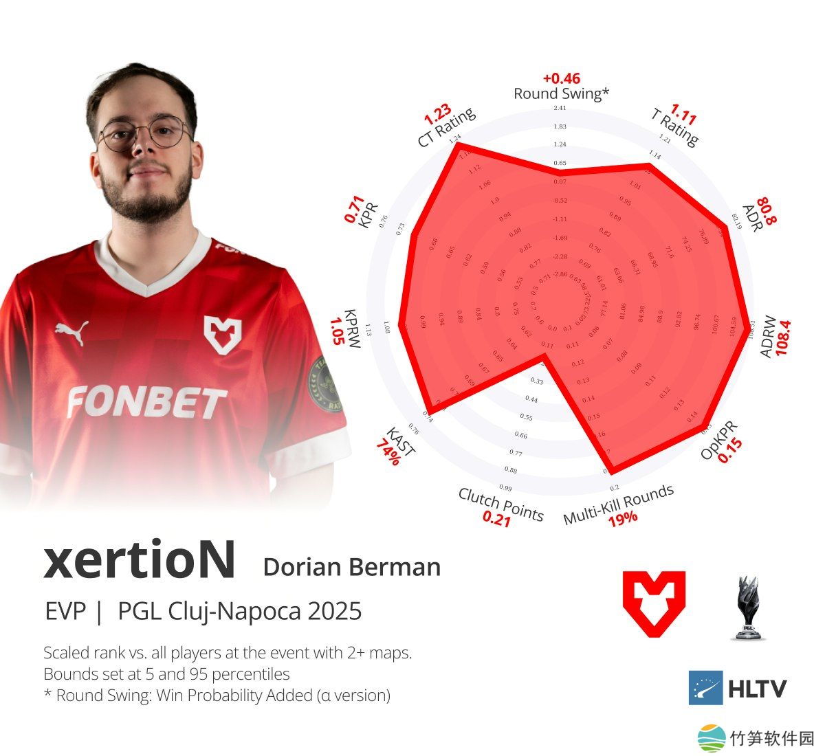 xertioN的整体赛事数据并不突出,但他在MOUZ七淘汰赛地图胜利中的四场中成为队内最佳选手,在地图胜利中表现最佳(1.37rating,+2.37 RS),并在回合胜利中领先(1.05 KPRW,108.4 ADRW)。