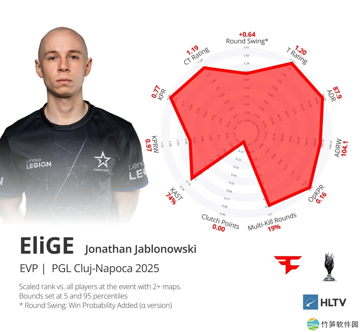 作为rating3.0开发过程的一部分,我们在2025年的EVP图表中新增了一项指标。在IEM 卡托维兹中,我们使用了“WPA”(获胜概率附加值)这一术语,但我们决定将其更名为通俗易懂的“回合影响力”(Round Swing)。