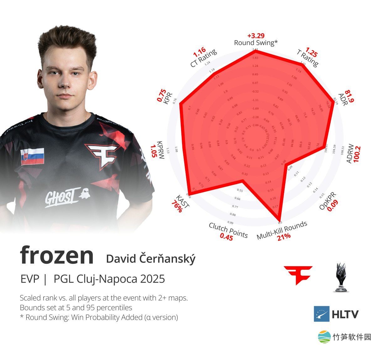 frozen在小组赛中摧毁了对手,面对Eternal Fire和MOUZ的强劲对手,他以1.36的rating和惊人的+5.15回合影响力结束了小组赛。
