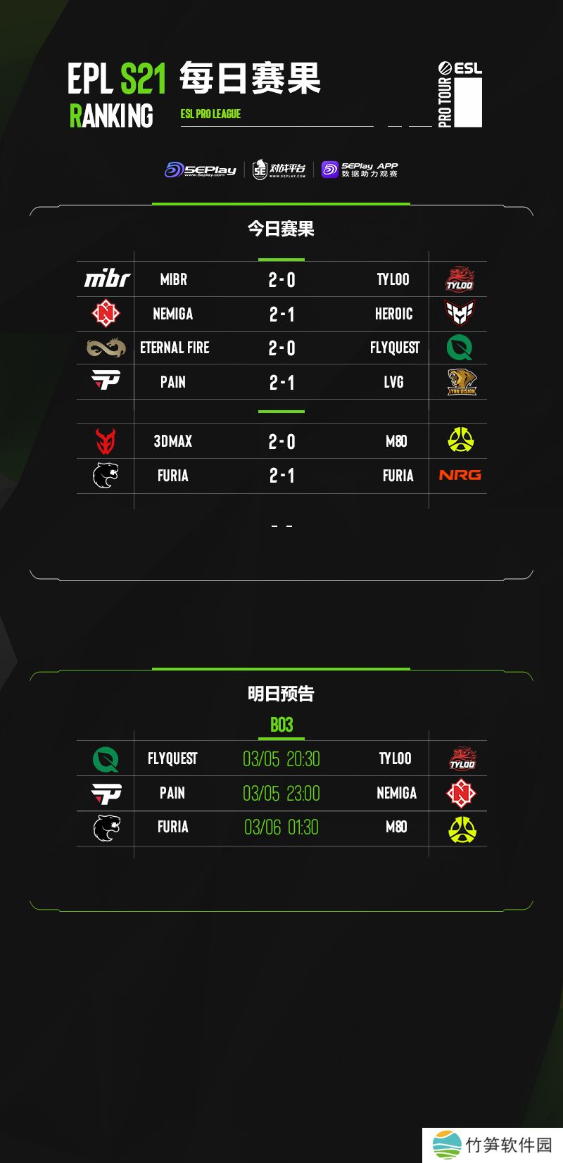 EPL S21入围赛第四日比赛已经结束,中国队伍TYLOO还是未能传来喜讯,他们0-2负于MIBR掉入2-2组,MIBR则是成功晋级正赛。除了MIBR,TYLOO曾经战胜过的Eternal Fire和3DMAX携手晋级正赛。而另一支中国队伍Lynn Vision则是遗憾不敌paiN,遭遇淘汰。同样遭到淘汰的队伍还有HeroicHEROIC和NRG。在明日比赛中,TYLOO将迎来亚太地区的老对手FlyQuest。以下为今日赛果和明日预告: