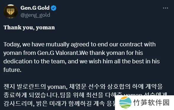 GEN无畏契约分部官宣了队内选手yoman离队的消息。