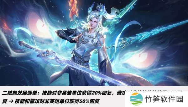 二技能对非英雄单位获得20%回复上调至50%回复,强化普攻对非英雄单位50%回复不变。