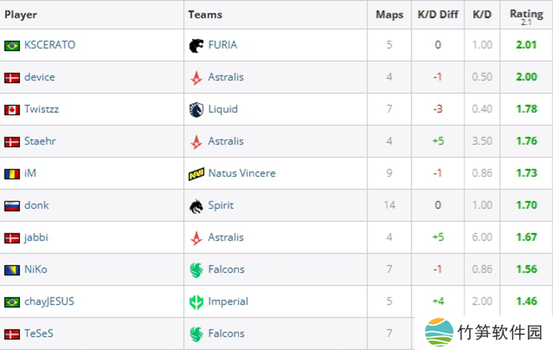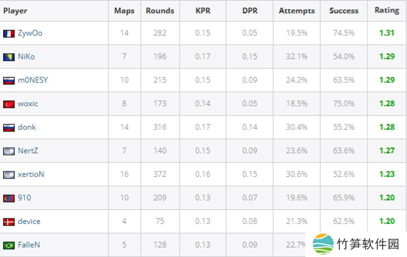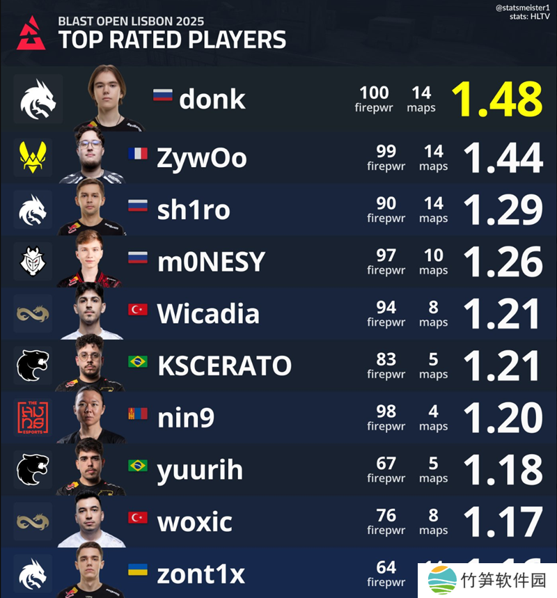 第一名是donk,他在14张地图上有着1.48的rating,同时他有着100的火力值。第二名是赛事MVP ZywOo,他在14图有着1.44的rating。第三名是sh1ro,14图有着1.29的rating。