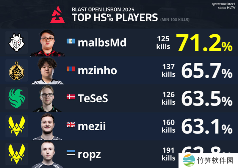 本次赛事的爆头王是malbsMd,他有71.2%的爆头率,而第二名是mzinho,为65.7%,第三名是TeSeS,为63.5%。