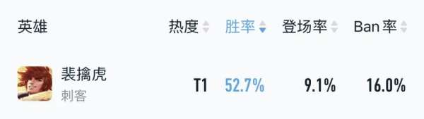 裴擒虎新赛季吃到了急速战靴加强的红利,巅峰赛52.7%胜率+25.1%禁选率,成为了中高分段综合表现最好的T0野王。