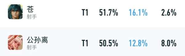 比如,苍和公孙离的巅峰赛数据就很稳定,毕竟他俩是技能型射手,可以吃满攻速装提升Ad的红利,前中期伤害会高不少。