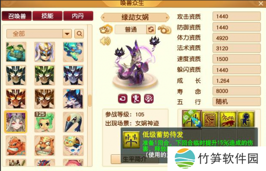 第三只:缘劫女娲,参战等级105级。缘劫女娲洗出来最多有4个技能,其中必带技能为低级蓄势待发,该技能也是新出的特殊技能之一,技能效果是准备1回合,下回合临时提升15%造成的伤害,释放随机2个主动技能攻击,纯粹是点杀必备技能。