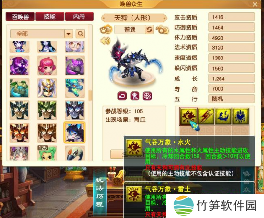 第一只:天狗(兽形),参战等级65级。兽形天狗最多可以洗出4个技能,且没有必带的技能,洗出来的资质攻击、防御上限1380,速度资质1260,成长1.224。兽形天狗携带的特殊技能是“气吞万象,水火/雷土”,使用水火技能,可以施放所以水属性和火属性主动技能,包含大水、大火、小水、小火,使用雷土与水火情况类似。相信看到这里,大家心中都跳出了观照万象技能,可以施放所有主动技能,这里的气吞万象纯粹的是观照万象简化版,有玩家调侃,直接起名字叫“千照万象”更容易理解。