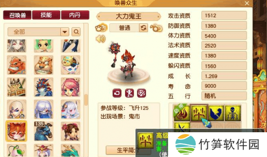 第四只:大力鬼王,参战等级飞升125级。大力鬼王最多可以洗出5个技能,其中大火是必带,除此之外还有高级蓄势待发技能,准备1回合,下回合临时提升30%造成的伤害,释放随机2个主动技能攻击。高级技能果然是低级技能的加强版,点杀能力更强。