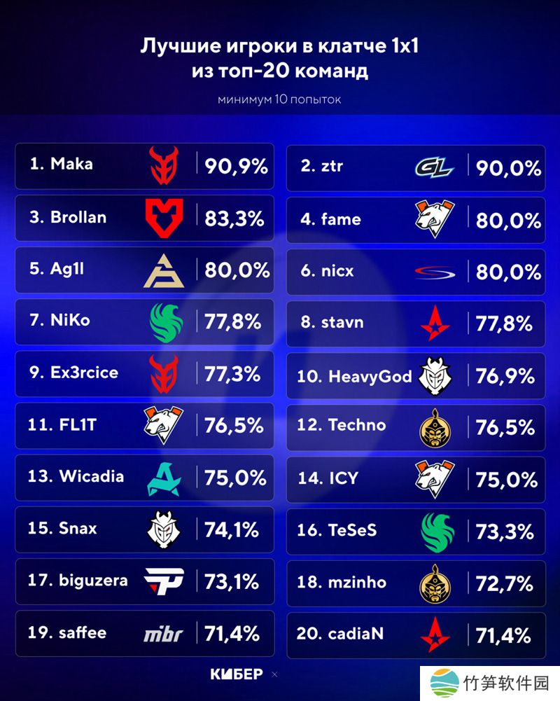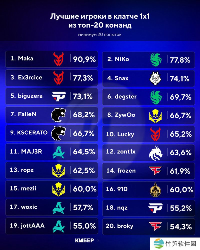 NiKo在我们的各项最佳榜单中都榜上有名,胜率稳定在77%。degster再次上榜,他赢下了近70%的残局,且有33次1v1残局的经历。
