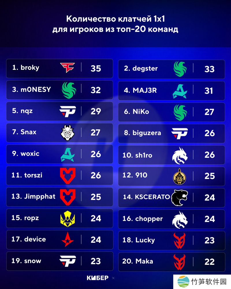 Falcons一下子有三名选手上榜,(因为m0NESY的转会,把他归纳为Falcons的选手)。值得注意的是,degster和m0NESY在1v1次数方面位列前三。