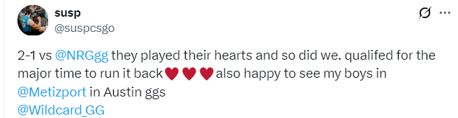 susp:2-1战胜了NRG,我们都全力以赴,成功晋级到了Major,是时候再次迎接挑战了。同时我也很高兴能看到我的前队友在Metizport的表现。
