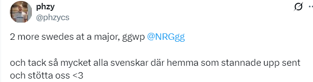 phzy:又有两名瑞典选手晋级到Major了,ggwp NRG!感谢所有在家中熬夜支持我们的瑞典朋友们。