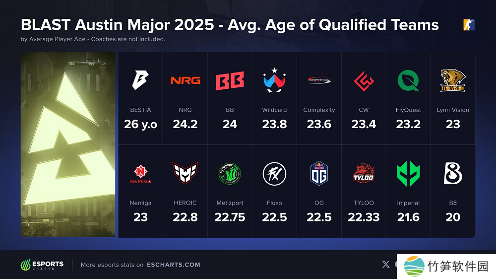 随着各赛区MRQ相继结束,16支晋级BLAST.tv 奥斯汀Major的队伍已全部出炉。赛后,国外知名数据统计门户网站Esports Charts统计了所有晋级队伍的选手平均年龄。