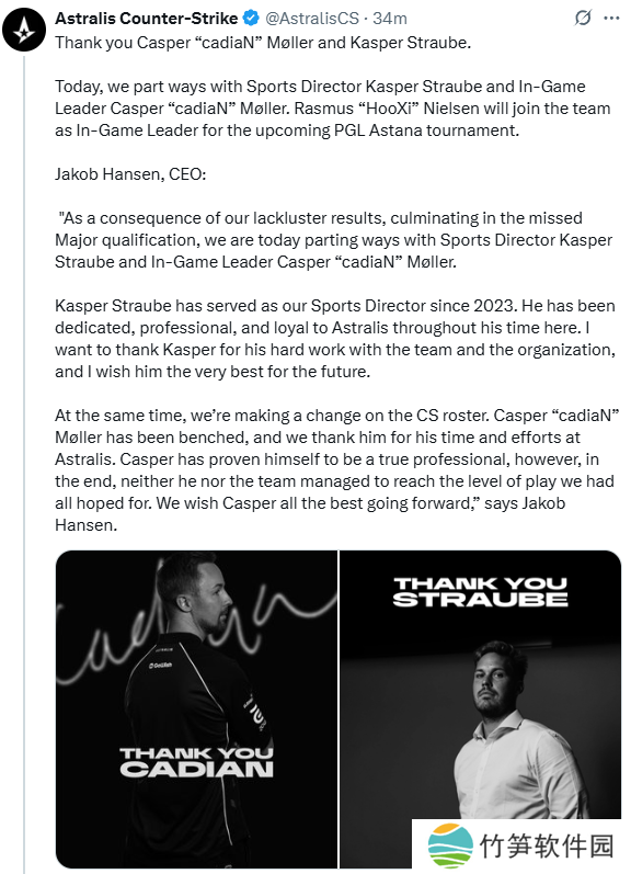 "由于近期战绩不佳,特别是未能取得Major晋级资格,我们决定与体育总监Kasper Straube及指挥位选手cadiaN分道扬镳。