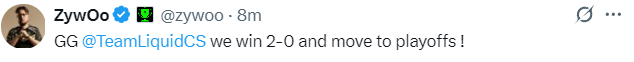 ZywOo:GG Liquid,我们以2-0的比分获胜,晋级淘汰赛!