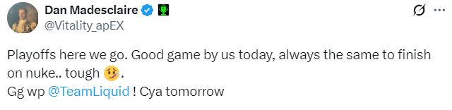 apEX:淘汰赛我们来了。今天我们打得很好,最近总是Nuke作为最终图结束比赛。Ggwp Liquid!明天见。