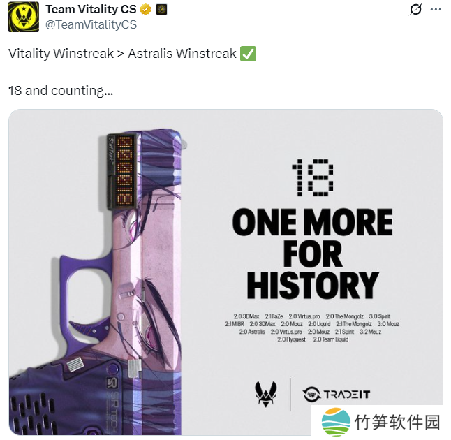 “Vitality连胜 > Astralis连胜。目前已达到18场,仍在继续...”