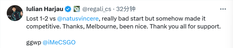 regali:1-2不敌NAVI,虽然开局不利,但我们还是让比赛变得精彩起来了。感谢墨尔本的支持。