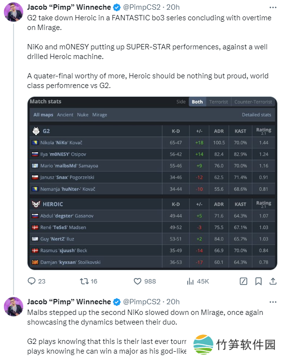 “G2凭借在Mirage加时赛的精彩表现击败了HEROIC。NiKo和m0NESY以超级明星的表现,最终在BO3比赛中战胜了训练有素,执行力如同机器一般的HEROIC。