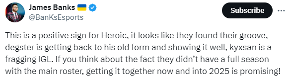 “对于HEROIC而言,这是一个很好的信号,他们似乎已经找到了自己的比赛节奏,degster也正在找回昔日的状态并有出色的表现,kyxsan则是一名令人折服的刚枪指挥。如果考虑到他们的主力阵容还没有完整打过一个赛季,那么从现在开始,到2025年的磨合看起来大有希望!”