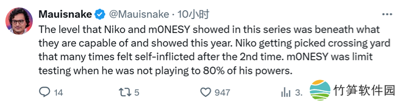 Mauisnake:NiKo和m0NESY在这个BO3中表现出的水平低于他们今年的能力和表现。NiKo在外场那么多次被击杀,感觉是对G2的二次伤害。m0NESY在没有发挥出自己80%的实力时,就已经是极限测试了。
