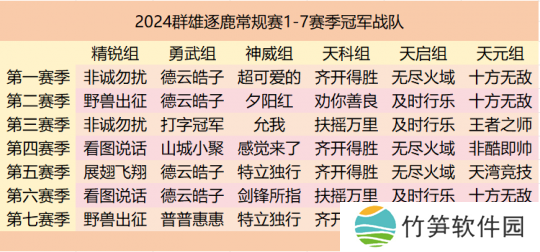 下面是小美为大家整理的今年群雄逐鹿七个赛季六大组别的冠军战队,少侠们可以用来作为竞猜参考哦: