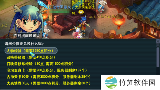 另外,使用过“售卡服务”的少侠,也不要忘记去秦府后院兑换自己的售卡积分。不但可以换取大量人物/宝宝经验,还可以换取泡泡变身卡、古神天书、大表情券等奖品哦。