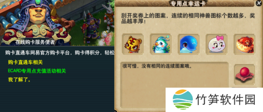 大家只要前往长安城(205,126)处点击“在线购卡服务使者”,选择“ECARD专用点充值活动相关”,即可领取包括大量经验在内的奖励,运气好的少侠还能获得特赦令牌、高级魔兽要诀哦。