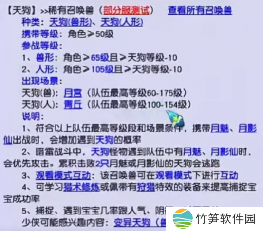 此外,想要捕捉天狗(人形)的少侠要注意了,角色等级要100-154级才能捕捉,并且携带月魅或月影仙召唤兽会增加遇到天狗的几率!