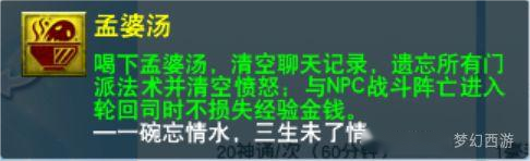 如果少侠们在进行高星神器等任务时处于灭队边缘,又担心自己“逃跑失败”,可以使用“孟婆汤”避免不必要的死亡损失哦。