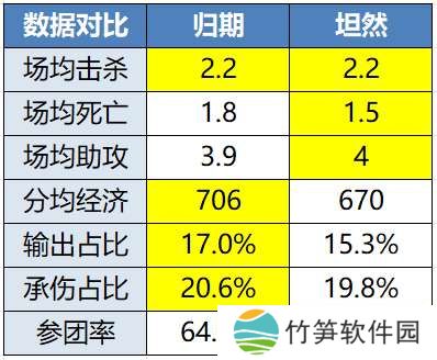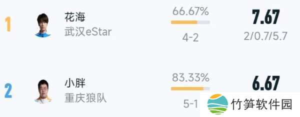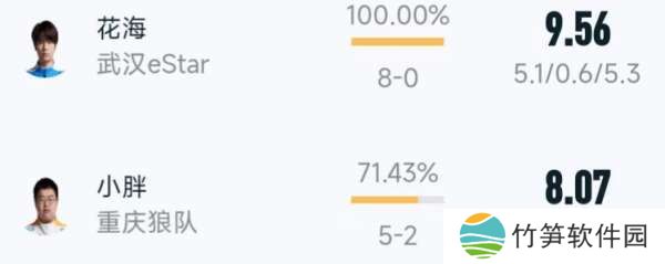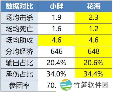 两位选手都是本届年总个人数据相当恐怖的打野,花海这边KDA、场均击杀、场均助攻、输出占比、承伤占比五项数据位列第一;小胖场均助攻第一,输出占比、承伤占比位列第二,与花海都只差零点几个百分点。