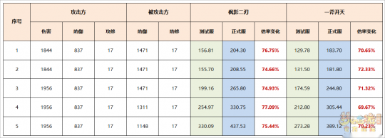 1、根据测试,可知测试服的枫影二刃伤害约为正式服的75%,一斧开天伤害约为正式服的70%。