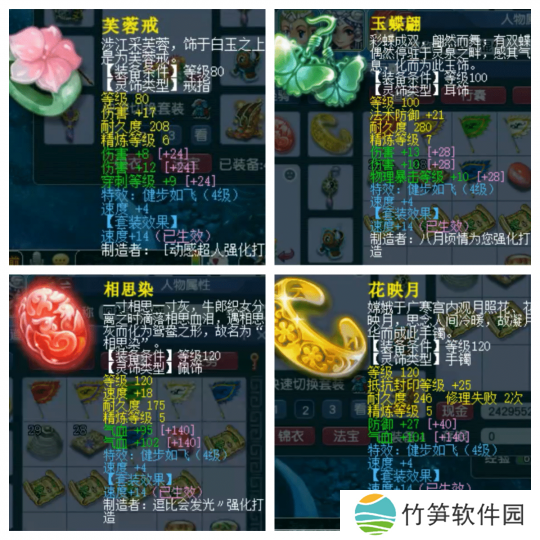 戒指下排双伤害一穿刺,耳饰下排双伤害一物暴,配饰下排双气血,手镯下排气血防御,特效都是4级健步如飞!