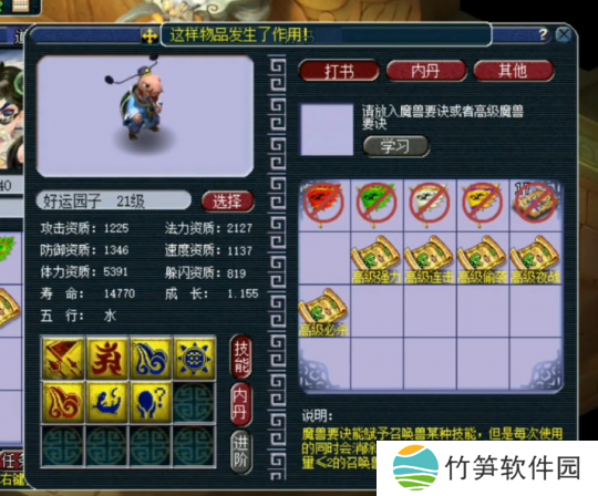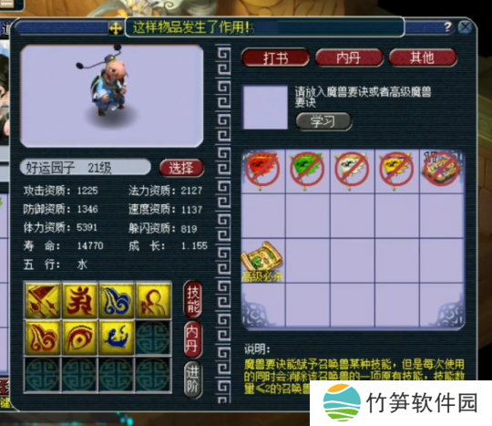 鉴于龟丞相这一召唤兽形象较为少见,高级合纵技能的触发概率相对较高。所以第一本可以打高级合纵,掉驱鬼。
