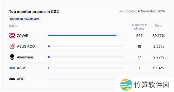 根据Prosettings数据显示,737位CS职业选手中89.77%正在使用卓威显示器,其他品牌占比按序降低分别为:华硕ROG、外星人、华硕、AOC,使用AOC显示器的仅有4人,占比0.54%。