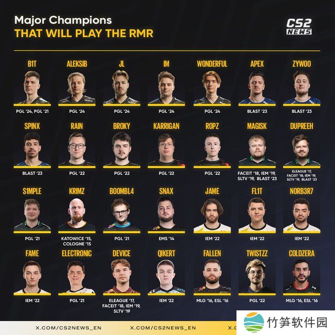 外媒统计了本次参加RMR的所有选手中曾经获得过Major冠军的选手,老A队王朝成员dupreeh、Magisk、device以5座与4座Major冠军奖杯领跑榜单,老将KRIMZ、FalleN、coldzera与在新老阵容的