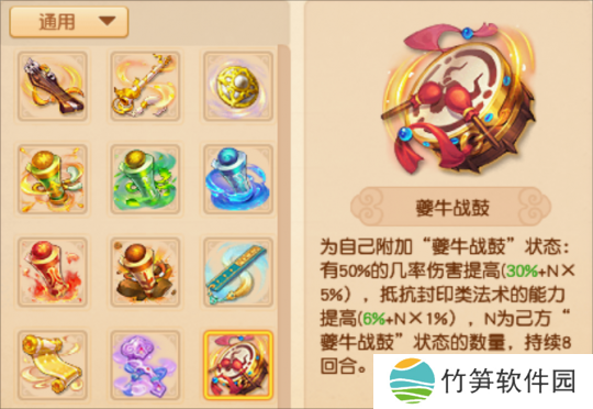 新效果:为自己附加“夔牛战鼓”状态:造成伤害时有50%的几率提高(30%+己方“夔牛战鼓”状态的数量×5%),抵抗封印类法术的能力提高(6%+己方“夔牛战鼓”状态的数量×1%),持续8回合,固定消耗4点灵元。
